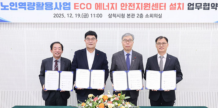 한국남부발전(주) 삼척빛드림본부(본부장 임경규)는 지난 12월 19일(금) 삼척시청에서 삼척시, 한국노인인력개발원 그리고 삼척시니어클럽과 함께 「ECO 에너지 안전지원센터」 조성을 위한 업무협약을 체결하였다.