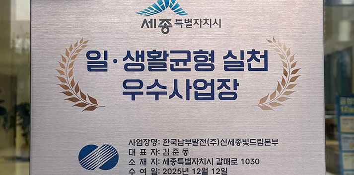 한국남부발전(주) 신세종빛드림본부(본부장 김현주)가 세종특별자치시 주관 '일·생활 균형 우수기업'에 선정됐다고 12일 밝혔다.