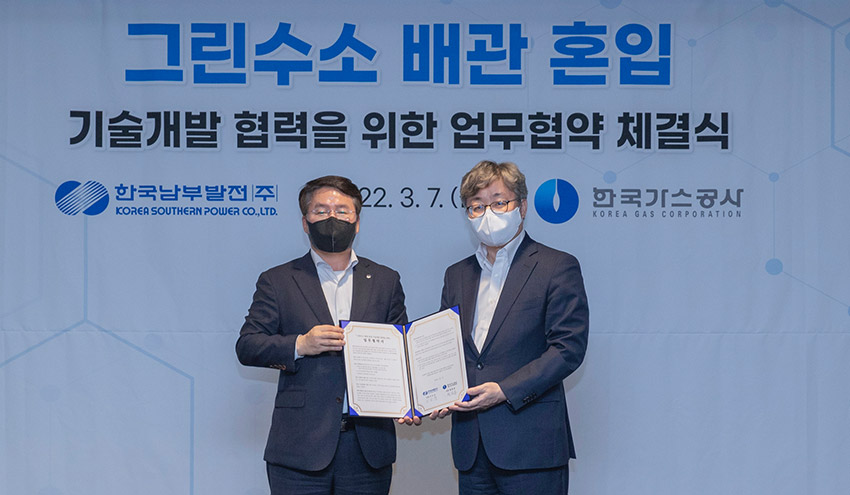 남부발전과 가스공사는 지난 3월 7일 제주 그랜드 조선 호텔에서 ‘그린 수소 배관 혼입 기술개발을 위한 업무협약’을 체결했다고 밝혔다.