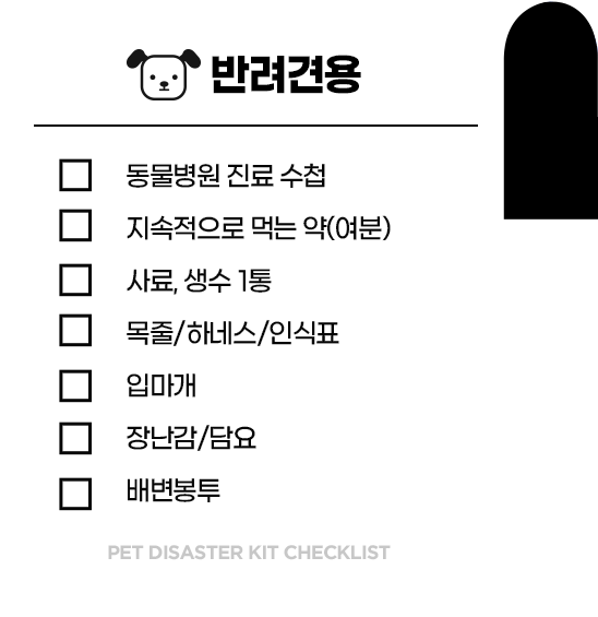 현재 우리나라 국민재난안전포털의 비상대처 요령에는 ‘재난 대피소 지침 – 반려동물은 대피소에 데려갈 수 없습니다. 단, 봉사용(장애인을 위한) 동물만 입장이 허가됩니다’라고 명시되어 있다. 그렇기에 현실적으로 재난 대피소에 반려동물을 데리고 가는 건 무리다. 단, 민간 구역의 대피소는 가능하니, 이동장에 반려동물을 넣어 이동하면 된다. 그리고 사전에 대피소까지 가는 동선을 미리 파악해두길 바란다. 만일 함께 대피할 수 없다면 반려동물의 목줄을 풀어주고, 최소 10일 정도의 물과 사료를 놔둬야 한다. 또한 평소 반려동물이 스트레스를 받으면 숨는 장소를 미리 알아두는 것도 좋다. 그래야 추후 반려동물을 찾을 때 좀 더 수월하게 찾을 수 있기 때문이다. 나아가 이런 일이 일어날 시를 대비해 동물등록을 미리 해두자.