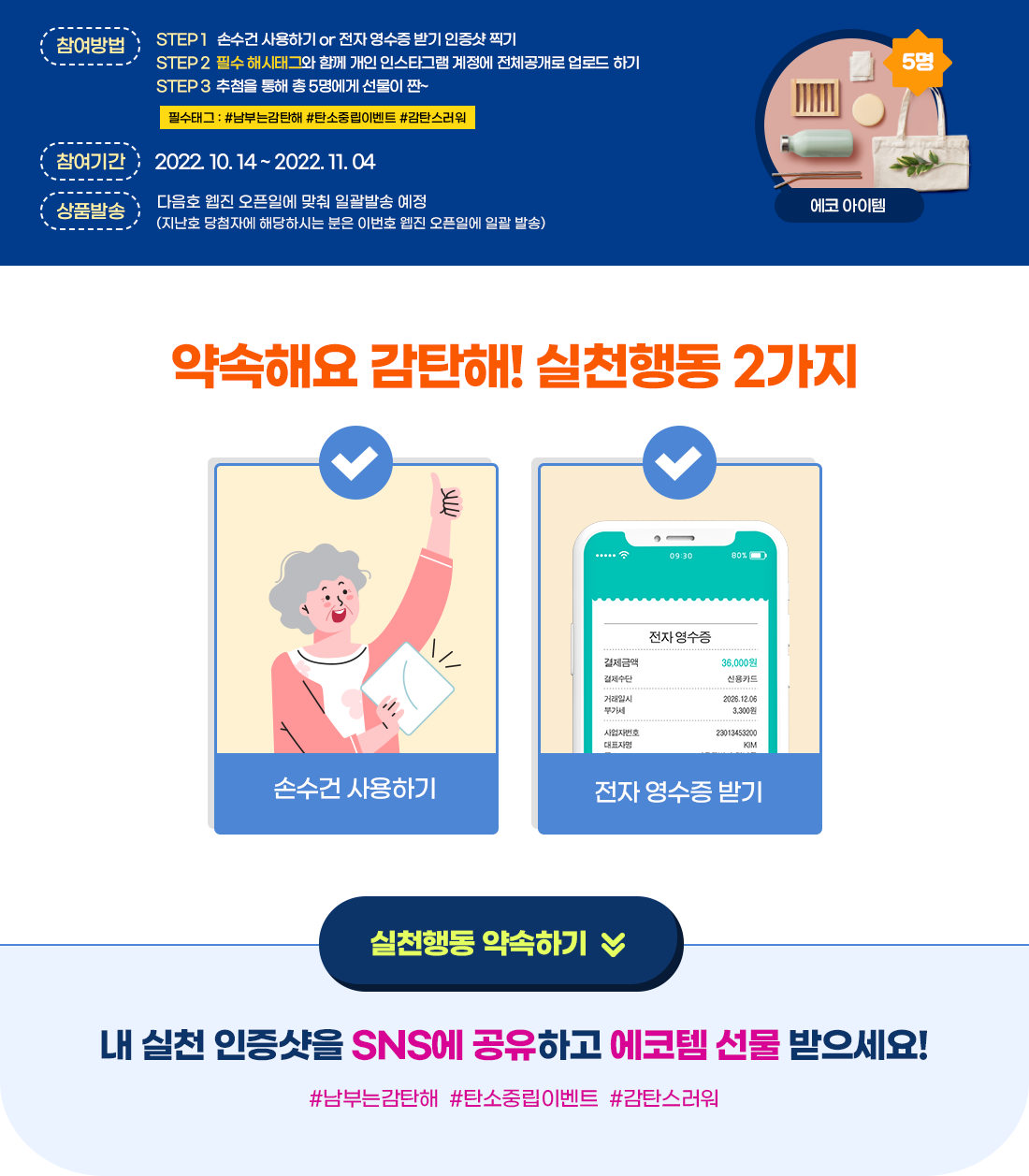 ‘손수건 사용하기’와 ‘전자 영수증 받기’ 중 한 가지를 실천하고 인증샷과 함께 필수 해시태그를 남겨주시면 추첨을 통해 소정의 상품을 드립니다.