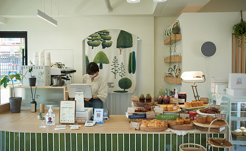 베이킹과 커피 및 음료 제조에 관심이 많은 편이었어요. 원래는 제가 인천공항에서 근무를 했었는데, 코로나19로 휴직기간이 길어지면서 ‘취미에 맞는 일을 하자’ 하는 마음이 들더라고요. 새벽부터 일어나 빵을 구워야 하지만 즐겁게 카페를 운영하고 있어요. 인테리어 콘셉트는 ‘초록’이에요. 제가 초록색을 좋아하거든요. 신경을 많이 썼죠.