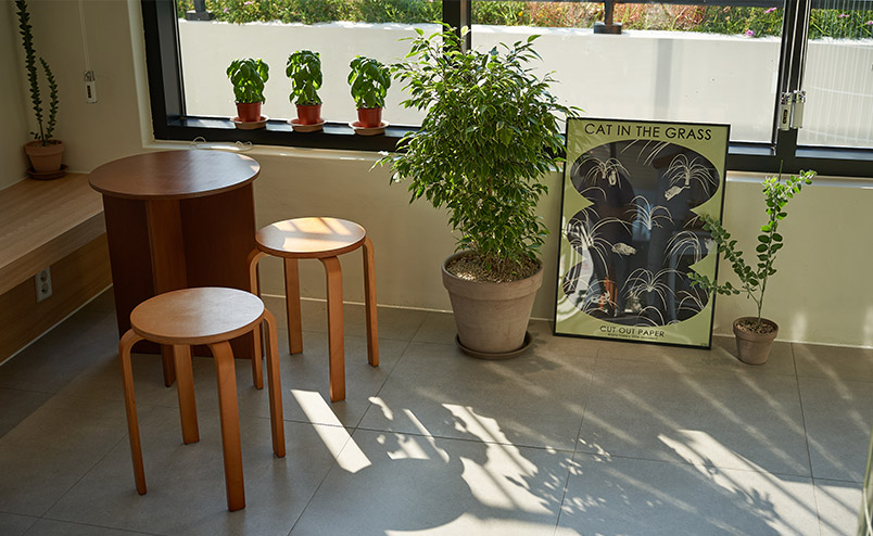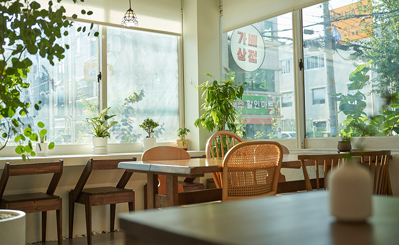 여기가 이전에 애견카페를 했다고 하더라고요. 그런데 굉장히 깨끗하게 잘 관리되어 있었어요. 그래서 벽은 페인트를 칠해 포인트를 줬고, 테이블과 의자를 구매하기 위해 인천까지 올라가서 발품을 팔았죠. 그때 정말 힘들었어요. 울산에서 인천까지 거리가 꽤 되잖아요? 가구도 카페 톤에 맞춰야 하고. 그러다 보니 요즘 유행하는 트렌드의 카페와는 분위기가 사뭇 달라요, 저희 카페가. 자연 친화적이죠. 그런 점을 좋아해주시는 손님들도 계시고요.
