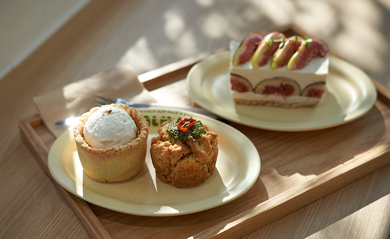 펌킨파이를 추천해드리고 싶어요. 많은 분들께서 좋아하시는 디저트이기도 하고요. 펌킨파이는 그 이름처럼 단호박을 주재료로 한 파이이에요. 또 무화과 크림치즈케이크도 인기가 높아요. 무화과 철 때 시즌 메뉴로 만들어서 손님들께 선보였는데, 생각보다 많은 분들이 즐겨 찾으시더라고요. 그래서 위에 올라가는 과일을 제철과일로 바꿔가는 형식으로 정식 메뉴에 올렸어요. 그리고 제가 초록색을 선호한다고 했잖아요? 초록색과 어울리는 음료를 시그니처 메뉴로 하면 좋지 않을까 싶어서 고안해낸 게 피스타치오 크림 커피에요. 기본 라테 위에 제가 만든 피스타치오 크림이 올라가죠.