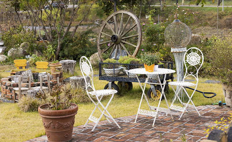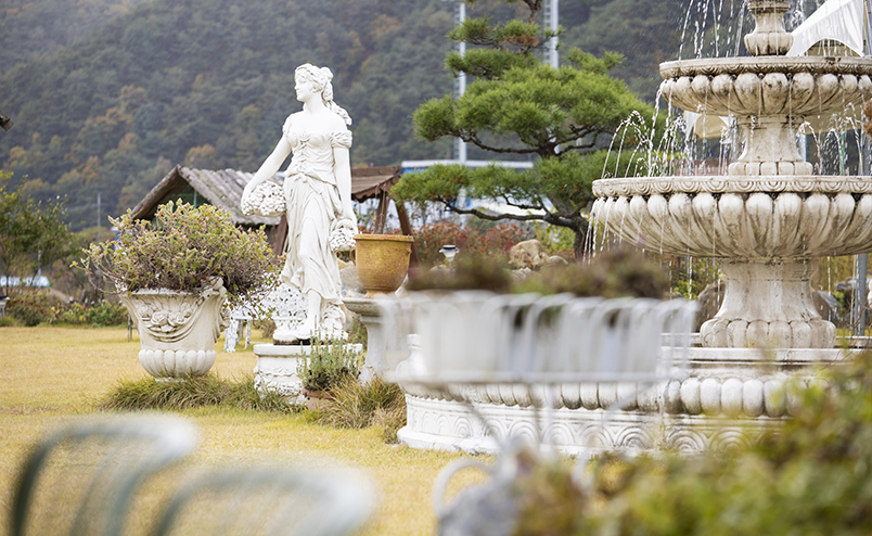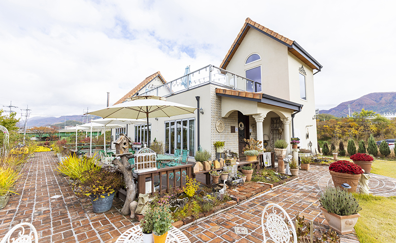 평창의 산세가 그림처럼 펼쳐져 있는 유럽풍 분위기의 카페다. 야외 정원에는 갖가지 야생화와 유럽풍 분수대가, 실내에는 클래식한 앤티크 가구와 소품이 눈길을 사로잡는다. 정원에 자리를 잡으면 주변 산세가 시원하게 내다보인다. 아이 혹은 반려견을 동반한 여행자들에게는 너른 잔디밭이 더욱 반갑다.