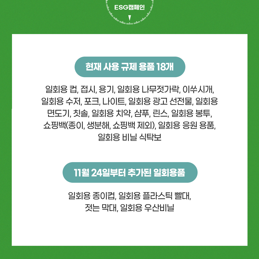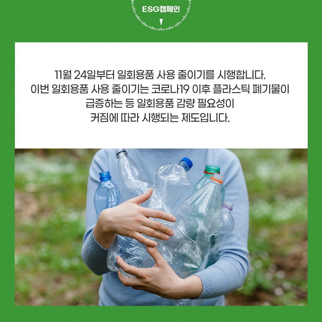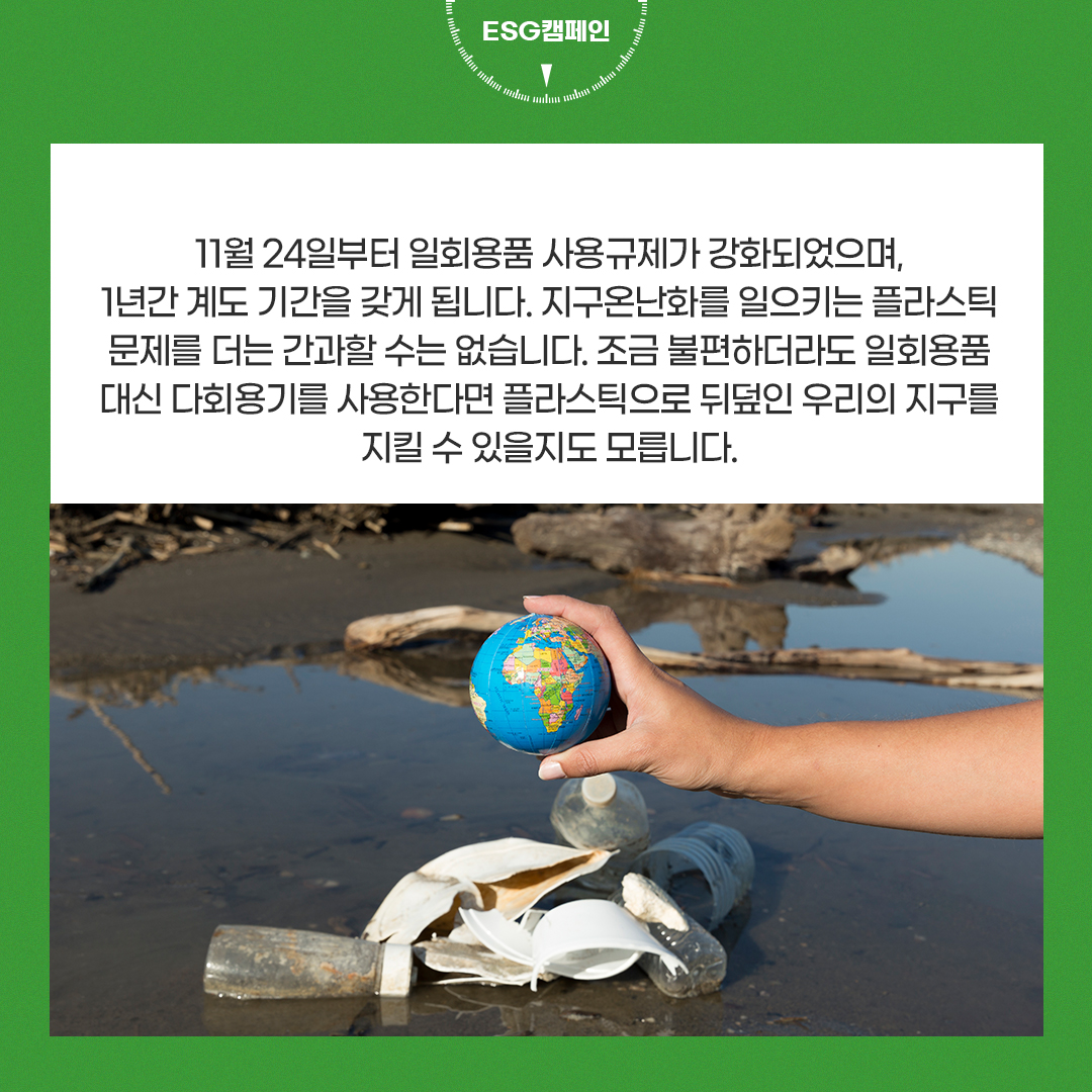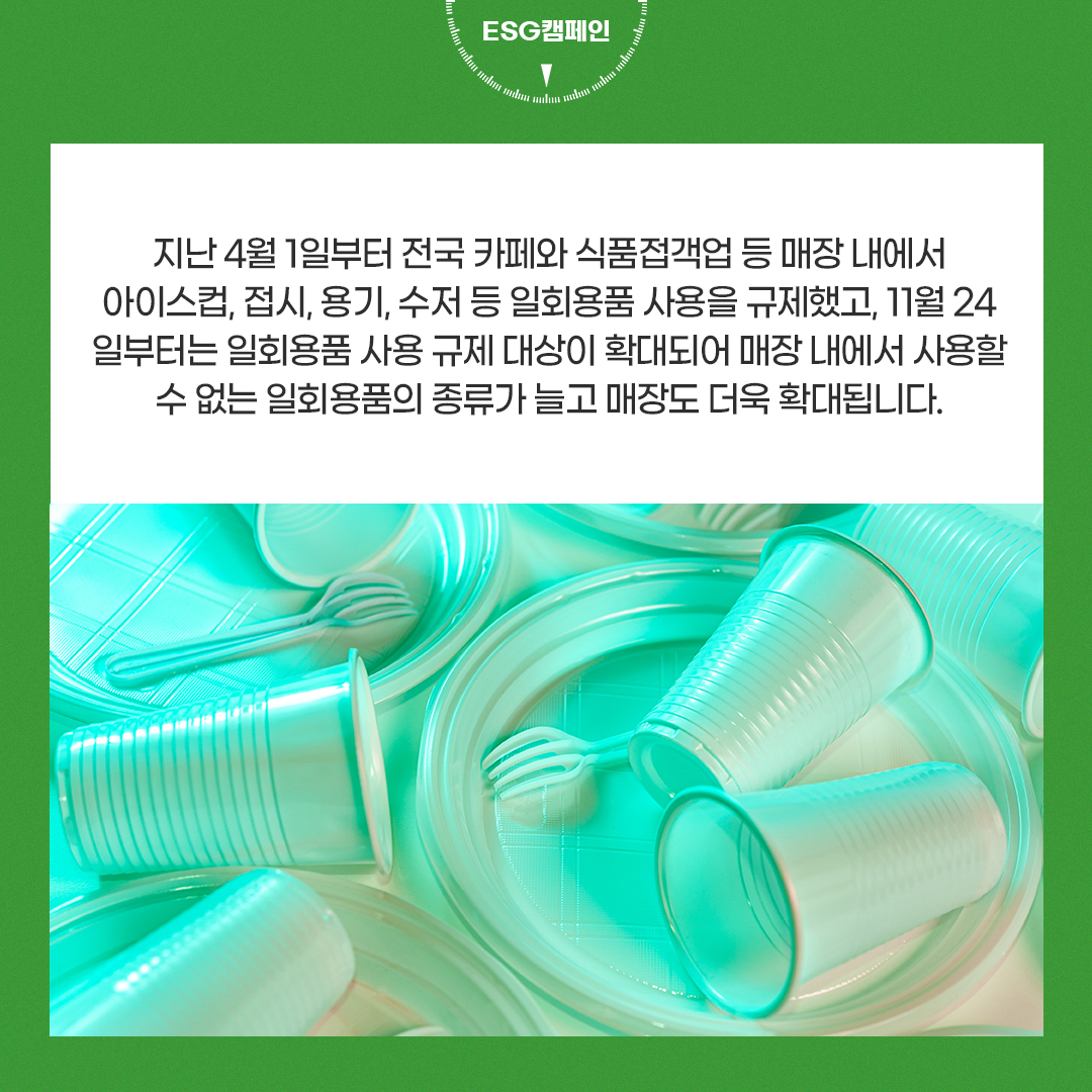 우리는 하루에 수많은 일회용품을 사용하고 버리고 있습니다. 종이컵, 빨대, 음료수 컵 등 일상생활 속의 수많은 물품이 일회용품에 해당됩니다. 사용하기엔 편리하지만 지구 환경에 심각한 피해를 주는 일회용품들. 정부는 지난 11월 24일부터 새로운 정책을 시행하며 일회용품 사용 규제를 강화해가고 있습니다.