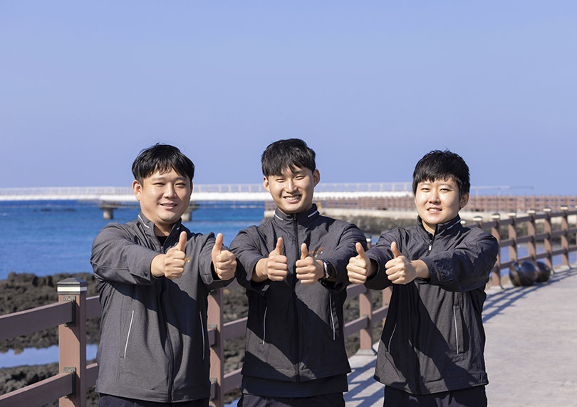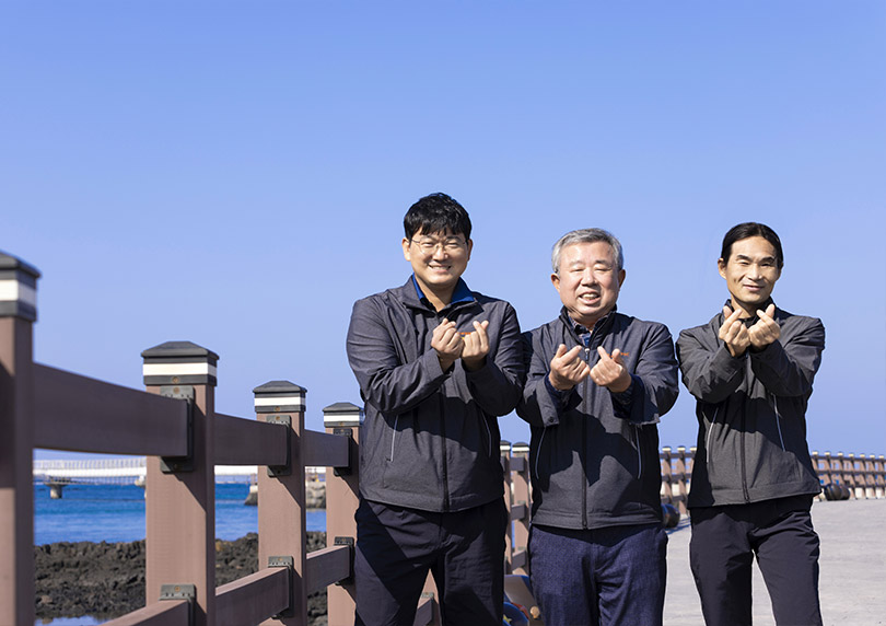 협재해수욕장을 지나 수월봉 방향으로 신창-차귀 해안도로를 달리다 보면 만날 수 있는 한경풍력발전단지는 여행객들에게 유명한 관광명소입니다. 파란 하늘, 에메랄드빛 바다, 하얀 풍력발전기가 아름답고 이국적인 풍경을 자아내기 때문이죠. 여기에서 근무하는 저희는 늘 볼 수 있는 풍경이지만, 그래도 볼 때마다 ‘와~!’하고 감탄사를 연발합니다. 특히 저녁노을이 질 무렵 풍경이 정말 장관인데요. 발전기에 올라 작업을 하다 그 풍경을 보노라면 마음이 편안해지고, 남제주빛드림본부의 직원과 함께 서로 얼굴을 마주 보고 웃습니다. 마음이 절로 무장해제가 되는 기분이라고 할까요! 제주의 비경 덕분에 더 사이좋게, 기분 좋게, 행복하게 일할 수 있습니다.