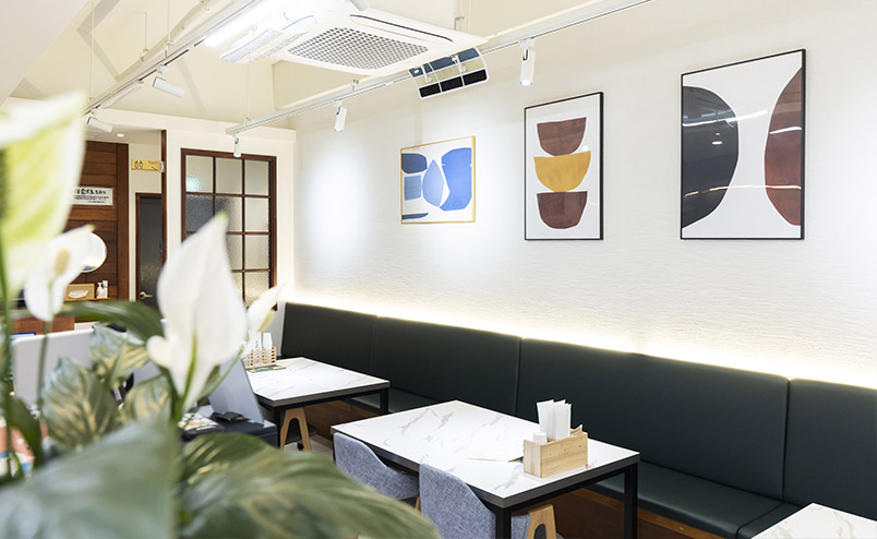 한방흑보쌈, 주꾸미볶음, 새우튀김, 오징어무침 등이 올라간 ‘해피테이블 한상 세트’가 대표 메뉴예요. 손님들이 상을 받으면 “와~ 진짜 한상이네!“라고 감탄을 하십니다. 일본 춘장을 이용해 만든 ‘한방흑보쌈 정식’과 신선한 주꾸미를 맛있게 양념해 선보이는 ‘주꾸미 정식’도 사랑받는 메뉴예요. 메인 요리와 함께 곁들이는 반찬도 매일매일 다른 구성으로 제공하고 있어요. 해피 테이블은 정성스럽고 건강한 음식을 지향해요. 그래서 제철의 신선한 재료를 이용하고 있고, 나트륨 사용도 최대한 줄이고 있어요. 덕분에 고객들로부터 ‘집에서 먹는 건강한 맛’이라는 칭찬을 많이 듣습니다. 카페 같은 실내 인테리어 분위기도 사랑을 받는 비결입니다.