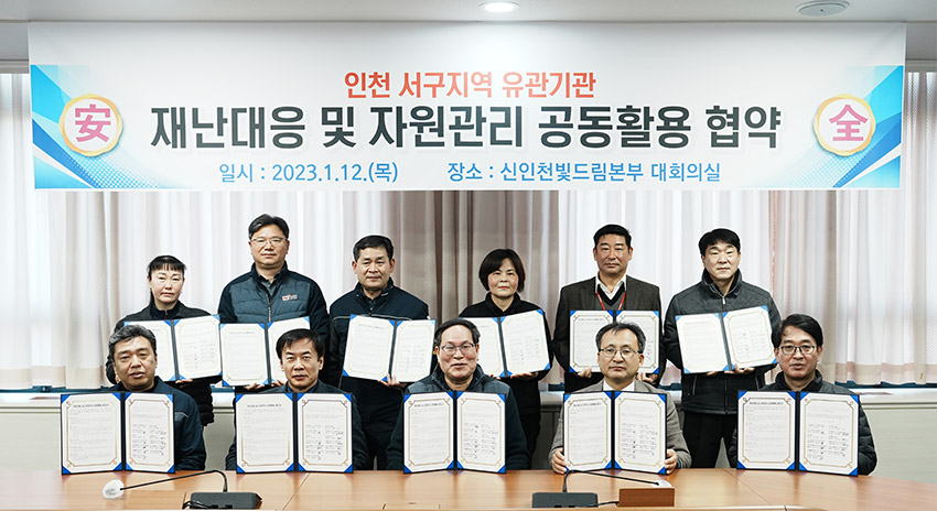 신인천빛드림본부 주관으로 1월 12일 본부 종합사옥 2층 대회의실에서 인천서구지역 13개 유관기관과 ‘재난대응 및 자원관리 공동활용 협약’을 체결하였다.