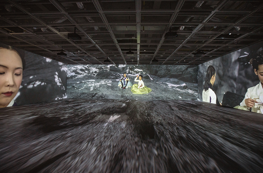 XR랩에 들어서니 그저 텅 빈 공간만 존재했다. 아무 것도 없는 공간인데 라는 생각이 든 무렵 음악소리가 나더니 갑자기 정면, 좌우, 바닥에서 영상들이 펼쳐진다. 방문 당시는 신윤복 화가의 <X 미인도>가 전시되고 있었다. <미인도>, <단오풍정>, <월하정인> 등 신윤복의 대표적인 그림 속 인물들이 하나둘 살아나 뛰고, 걷고, 그네를 타고, 목욕을 하며 움직이기 시작했다. 시각특수효과 전문가, 사진가, 한복디자이너, 메이크업 아티스트가 서로 협력해 만들어간 이 작품을 보노라면 2차원에서 느낄 수 없었던 공간감, 시각 등이 깨어나 순간에 몰입되었다. 미술관 개관 당시에는 전자융합예술의 선구자로 불리는 알도 탐벨리니의 유작인 <우리는 디지털 시대의 원주민이다>가 상영되어 빛과 어둠이 연출된 공간을 시각적으로 구현되었다는 평을 받았다. 두 번째 전시로는 까마귀의 시선으로 본 울산의 모습이 담긴 <오감도>가 상영되어 많은 관람객이 찾았다고 한다. 어디에서도 볼 수 없는 미디어아트를 선보인 덕에 SNS 속 많은 이의 ‘인생사진’ 촬영 장소로 XR랩의 전시들이 업로드되고 있다.