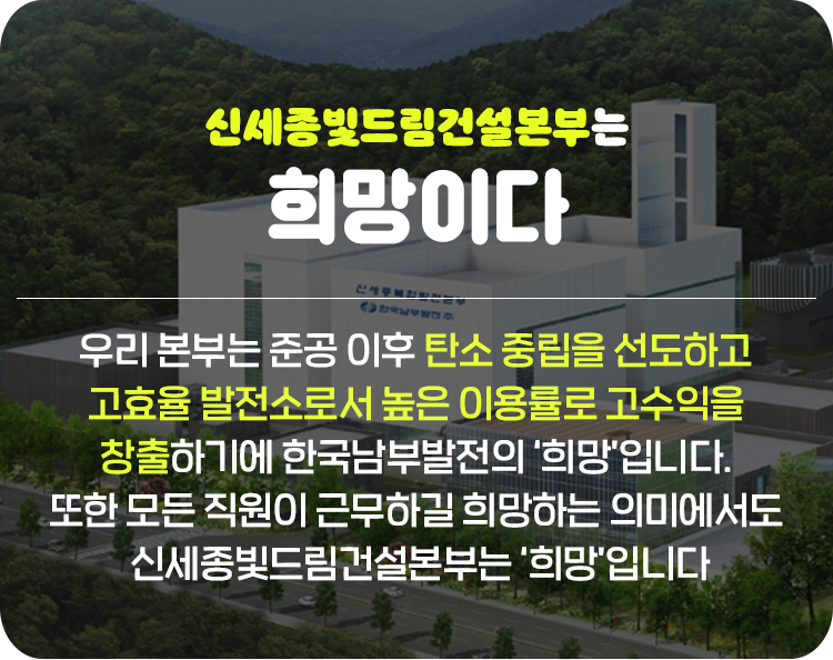 우리 본부는 국내 발전사 최초로 청정연료인 수소혼소가 가능한 가스터빈을 도입한 발전소를 건설하고 있습니다. 완료되면 최대 50%까지 수소혼소를 할 수 있습니다. 앞으로 수소에너지 시대를 선도할 발전소가 이곳이죠. 또한 세계 최고 수준의 질소산화물 저감설비를 도입할 것이며, 인공지능 시스템에 기반한 배출물질 제로화를 실현할 발전소입니다. 세종시의 약 15만 세대에 전기를 공급하면서 약 9만 세대에 열 공급을 할 명실상부 최고의 복합발전소를 만들기 위해 열정을 쏟고 있는 곳이 바로 신세종빛드림건설본부입니다.