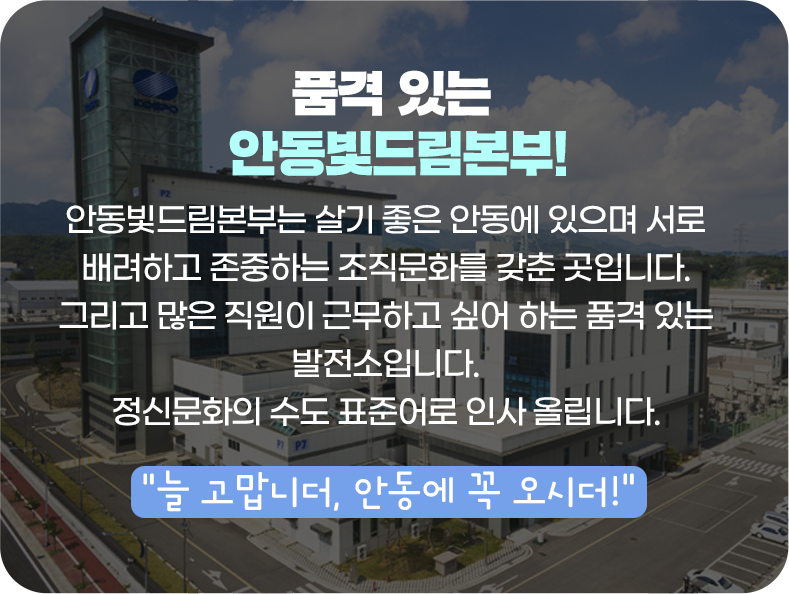 안동빛드림본부는 우리 회사에서 제일 작은 규모(361MW)의 발전소이지만 효율이 높아 매일 가동되고 있습니다. 전력거래소에서 안동빛드림본부의 출력을 조정하면서 전력계통의 안정을 도모하는 중요한 발전기입니다. 위치는 안동시 풍산읍 경북바이오산업단지 내에 있으며, 직원은 약 100명 정도 근무하고 있습니다. 현재 2호기 건설을 위해 준비 중인데 건설이 완료되면 900MW 규모로 확대될 예정입니다. 또한 안동빛드림본부는 직원들이 근무하고 싶어 하는 선호 사업장입니다. 국내 발전소 중 공정안전관리(PSM)의 유일한 최고등급(P) 발전소로서 안전하고 효율 높은 설비운영을 자랑하죠. 안동이라는 지역 특색 때문일까요. 직원들은 선비처럼 청렴하고 배려심이 높아요. 소통이 잘되고요. 거기다가 5분 거리에 경북도청 신도시가 있는 매력적인 곳입니다.