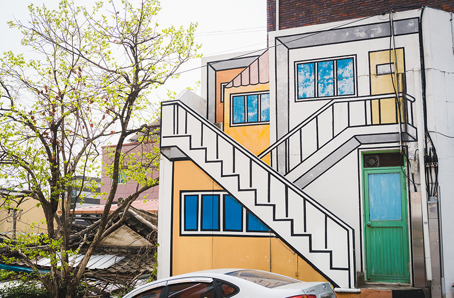 신세동 벽화마을로 가는 길에 제일 처음 본 벽화는 거대한 고등어다. 실감 나게 그려진 이 벽화를 시작으로 집과 조화를 이룬 벽화가 나타났다. 멋스러운 기와지붕이 있는 집의 황토 벽면에는 누런 소가 사는 외양간이, 담장 너머로 커다란 가지를 뻗은 나무가 있는 집의 벽에는 아이와 강아지가 자작나무 사이로 신이 나게 눈썰매를 타고 있다. 어떤 벽면에는 어린 여자아이가 물을 긷기 위해 우물로 향한다. 신세동 옆 법흥동의 해동사 주변을 걷다 3층 건물 벽면 전체를 차지한 거대한 꽃 사이로 강아지가 꼬리를 흔드는 벽화가 보였다. 본격적인 신세동 벽화마을의 탐방이 시작됐다.