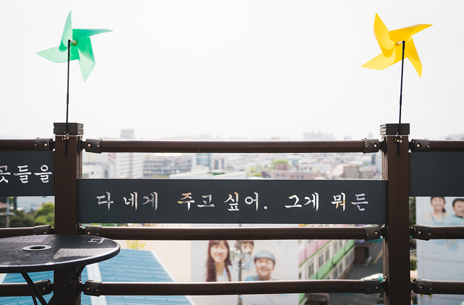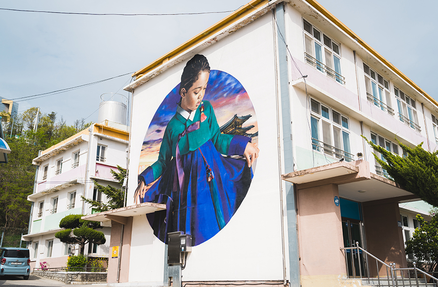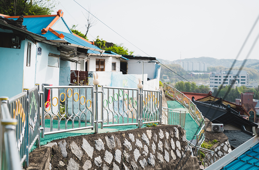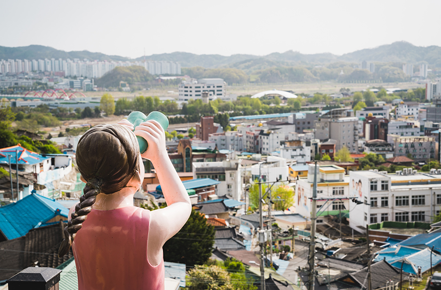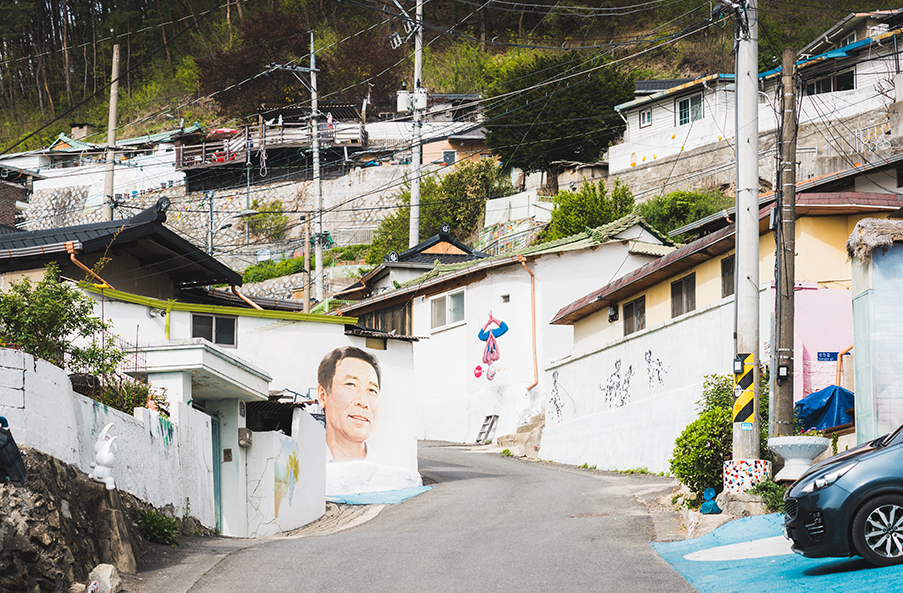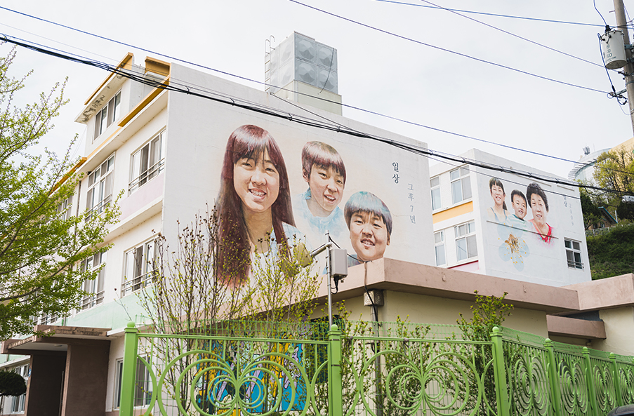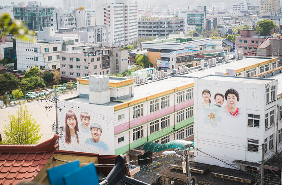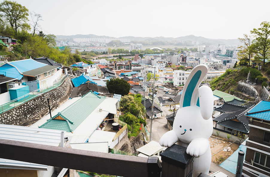 벽화 탐방의 출발점은 동부초등학교다. 그라피티 아티스트로 유명한 로얄독(Royyal Dog)이 그린 그라피티 벽화가 이곳에 있다. 로얄독이란 이름으로 활동하는 심찬양 씨는 미국에서 힙합 문화와 한국적 정서를 조화롭게 표현해 주목받는 작가다. 한복 입은 미셸 오바마 여사, 색동저고리를 입은 흑인 여자아이 등 외국인 여성과 한복을 조합한 모습이 그의 대표적인 그라피티다. 2019년에 그가 동부초등학교에 그린 그림인 ‘한복 입은 흑인아이, 벨라’ 역시 그의 대표적인 스타일을 보여 준다. 거대한 벽화를 시작으로 구석구석에 숨어있는 벽화 찾기를 시작했다. 로얄독 작품의 반대 벽면에는 동네 주민의 얼굴이 있다. ‘일상 2009’라는 벽화 속에는 할머니와 손주들이 활짝 웃는 모습으로 그려져 있고, 그 옆으로 벽화가 그려진 지 7년이 지나 훌쩍 커버린 손주들의 모습이 그려져 있다. 두 명의 손주에서 어느덧 손주가 한 명이 늘어난 모습이었다. 또 몇 년이 흐른 지금은 이 아이들은 훌쩍 자라나 성인이 되었겠지. 거리를 걸을 때마다 낡았지만 정감 어린 그림들이 하나둘 나타났다. 나팔꽃, 다람쥐, 동네 멋쟁이 아저씨, 오줌 누는 개, 바닥에서 피어난 이름 모를 꽃 그리고 중간마다 나타난 토끼 조형물…. 벽화와 토끼 조형물을 따라 이곳저곳을 누비다 전망대에 도착했다. 헉헉대는 숨을 고르고 있으니 전망대에 앉아 있던 동네 어르신들이 “힘들어서 우야꼬”, “우리같이 늙은이도 맨날 왔다리 갔다리하는데 와 그리 힘들어 하노”라며 말을 건넸다. 평생을 이곳에서 사셨다는 어르신은 동부초등학교를 다녀 어린 시절부터 오르막길을 오르락내리락했다고. 천천히 걷다 보면 적응이 된다고. 전망대에 앉아 숨을 고르라고 하셨다. 느지막한 오후, 바람을 맞으며 일과를 마무리하신다는 어르신. 이방인이 어색할 법도 하건만 두런두런 어린 시절 이야기는 전해주셨다.