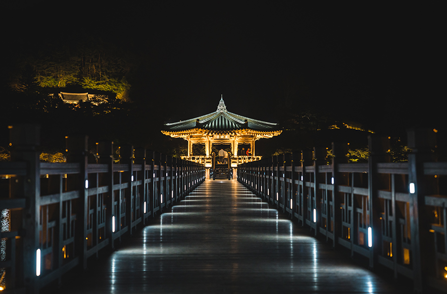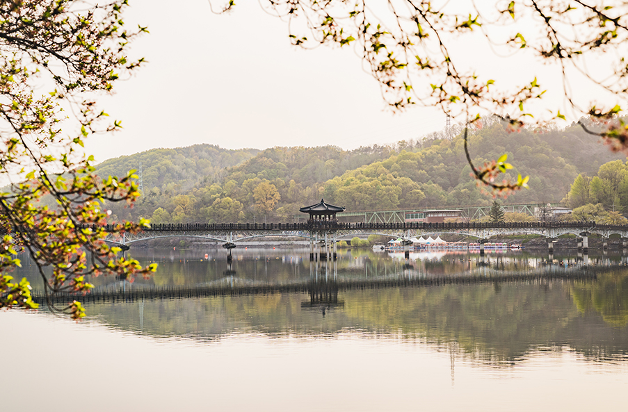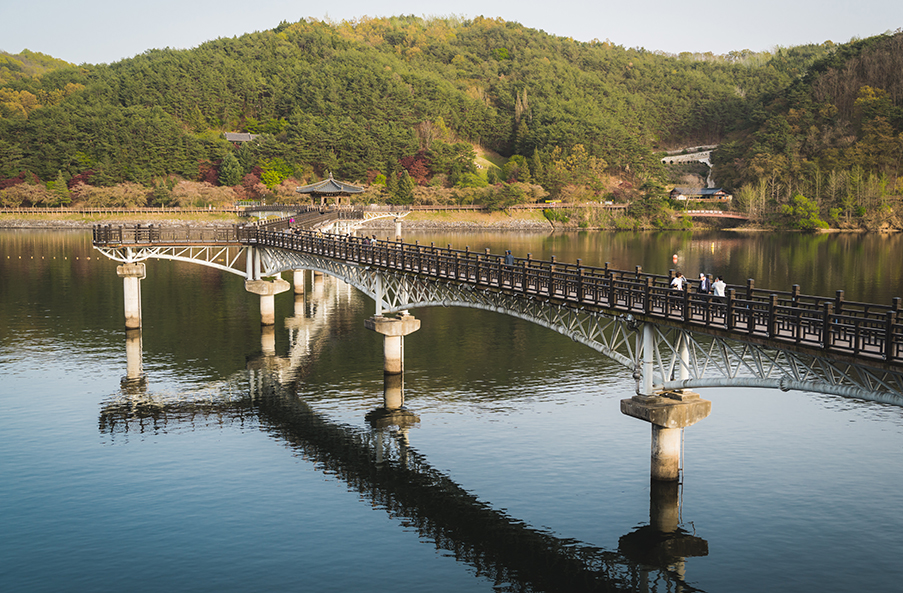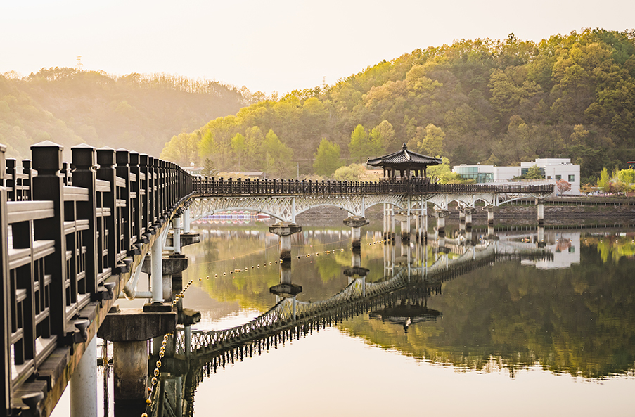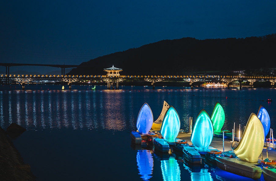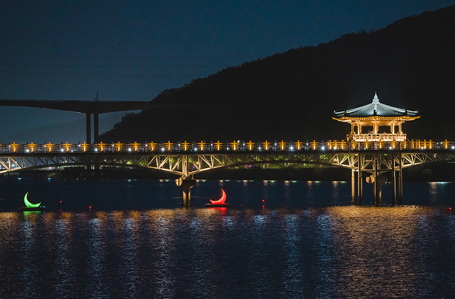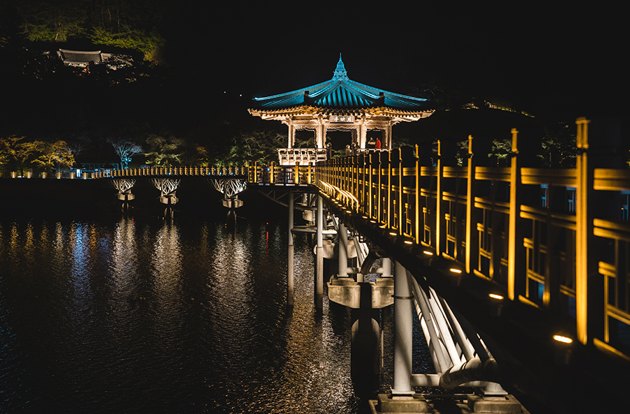 월영교는 안동민속촌이나 월영공원을 통해 걸을 수 있다. 어느 방향에서 걸어도 아름다운 야경을 감상하기 충분했다. 삐거덕거리는 월영교 위에서 이곳저곳 야경을 바라보고 월영교 옆 수변 ‘원이 엄마 테마길’을 걷고 있는데 난데없이 강 한 가운데에서 “에헤라~” “좋다.” “여가 천국이여. 좋오타.”라는 소리가 들려왔다. loT 기술을 접목한 초승달 모양의 전동보트인 ‘문보트’에 탑승한 사람들의 목소리였다. 트로트 노랫가락도 신나게 들려왔다. 가만히 그들을 바라보고 있으니 누군가 “어마이가 좋은가봅니더”라며 말을 전했다. 문보트에 탄 사람들의 일행이었다. 90살이 넘은 노모가 몇 년 만에 아들, 딸이 만나 신명이 났단다. 기분 좋게 살랑이며 불어오는 밤바람과 오랜만에 만난 자식들이 옆에 있으니 이곳이 천국이란다. 천천히 깊어져 가는 어둠 사이로 유유히 흘러가는 물길을 가르며 뭉그적뭉그적 들어오는 문보트를 바라보자니 원이 엄마 사연이 떠올랐다. 몇 해 만에 만난 이들이 이리도 반가워 무릉도원이라는 말이 저절로 나온다고 하는데 영영 만나지 못하는 곳으로 떠나버린 임이 보고 싶은 마음은 얼마나 애끓었을까. 그 그리운 마음의 깊이를 알 수는 없지만 이 풍경을 그리움으로 대신 짐작해 본다. 강물에 떠오른 아련한 달과 불빛이 영롱한 월영교 모습을 앞으로 밀려올 그리움 하나로 품어본다. 애틋한 월영교의 사연과 함께.