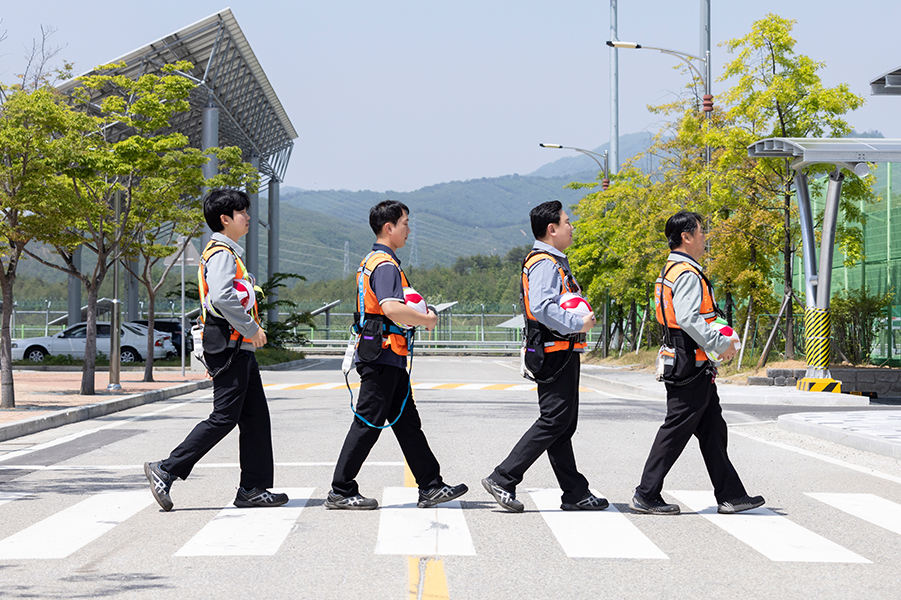 70만 평의 대지 위에 자리 잡은 삼척빛드림본부. 매일 이곳 정문을 들어오고 나가는 사람은 1,000여 명이다. 수없이 많은 사람이 이곳에 출입해서 집으로 돌아가는 순간까지 안전할 수 있도록 앞, 뒤에서 묵묵히 지켜보는 이들이 있으니 바로 안전 파수꾼 안전재난부 직원들이다.