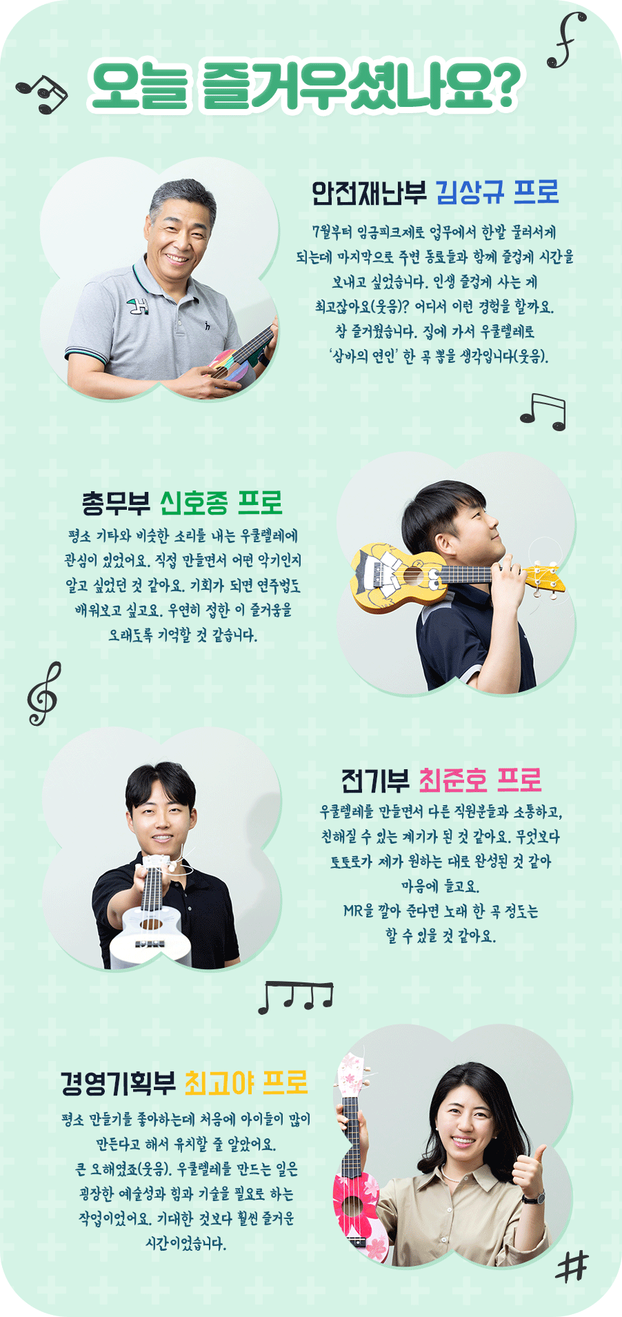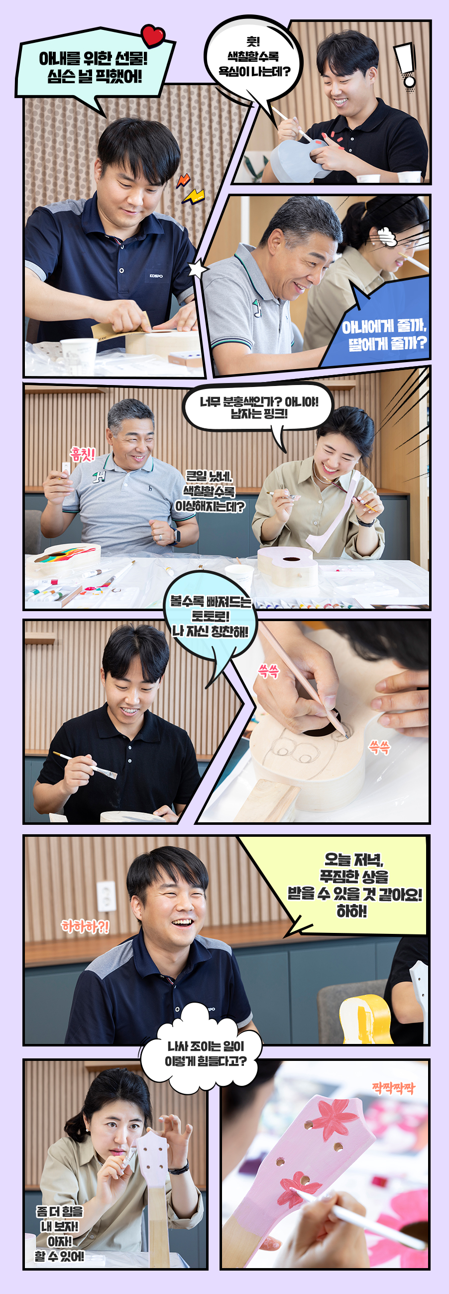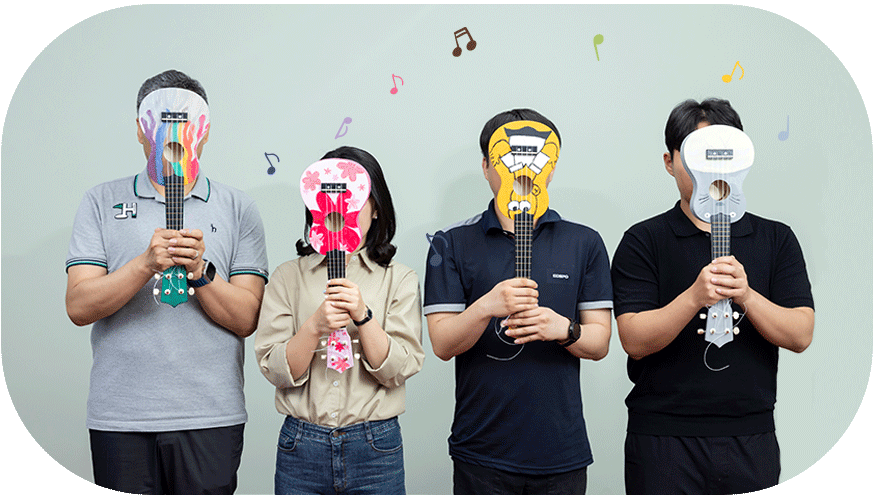 우쿨렐레를 직접 만든다는 낯선 즐거움의 기대감으로 모인 직원들은 안전재난부의 김상규 프로, 경영기획부 최고야 프로, 전기부 최준호 프로다. 우쿨렐레를 만들기 전 지나가던 총무부 신호종 프로는 최준호 프로의 “같이 만드실래요?”라는 한 마디 제안에 흔쾌히 응하며 합류했다. 길거리 캐스팅인 셈이다. “아내나 딸에게 줄 생각인데 둘 다 거절하면 어쩌지?”라며 농담하는 김상규 프로. 네 사람 모두 사랑하는 가족, 여자친구, 지인에게 줄 선물인 만큼 잘 만들어 보겠다는 의지가 눈에 보인다고 할까.