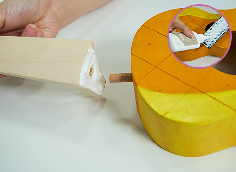 울림통과 연결목에 목공풀을 발라 울림통에 끼워준 후 건조시킨다. 그리고 연결목 위에 지판, 상현주를 목공풀로 붙이고 마를 때까지 기다린다.