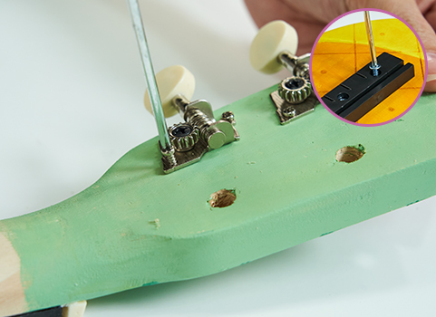 연결목 상단의 구멍과 줄감개를 맞춰 나사로 고정시키고 울림통에는 브릿지를 나사로 연결한다.