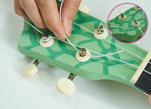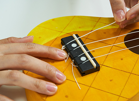 4개의 줄 끝 부분을 매듭짓고 울림통의 브릿지 구멍에 얇은 줄부터 굵은 줄 순으로 맞춰 끼운다.