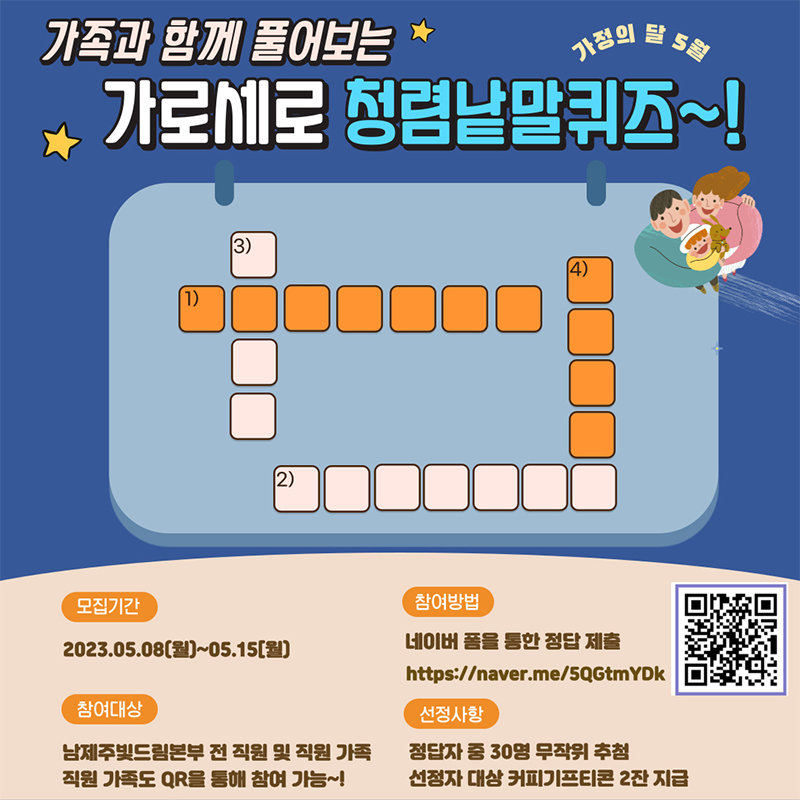 남제주빛드림본부은 5월 가정의 달을 맞이하여 직원과 직원 가족의 청렴에 대한 관심 제고를 위해 ‘가족과 함께 풀어보는 가로세로 청렴낱말퀴즈’를 시행했다.