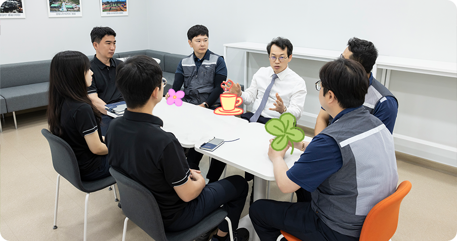 처음 왔을 때가 느꼈던 건 사람들이 경직되어 있다는 것입니다. 우리 회사와 협력사는 하나의 울타리에서 생활하는 식구입니다. 그런데 업무적으로 무언가를 주고받는 걸 부담스러워한다고 느꼈습니다. 그래서 소통 프로그램을 만들어야겠다고 생각했죠. 서로 함께 어울리며 체육 활동을 할 수 있도록 체육시설을 복구한 것도 그 일환입니다. 이 외에도 만남의 자리를 많이 만들려고 노력하고 있습니다. 전 우리 본부에서 근무하는 모든 사람이 행복함을 느꼈으면 좋겠어요. 그렇지 않은 분위기에서는 업무적으로 긴밀한 관계가 되기 어렵지 않을까요? 이 자리 역시 그런 이유에서 마련한 자리예요. 그러니 모두 허심탄회하게 이야기해 주시면 반영하도록 하겠습니다.