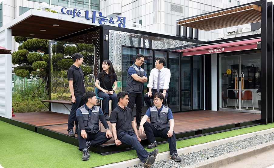 전 카페가 만들어지기 전에 파견을 나가 있어 소문으로만 들었어요. 처음 이야기를 들었을 때는 카페가 왜 생겼지 싶었는데 막상 접해보니 생각이 바뀌었어요. 일하는 도중이나 일이 끝나고 카페에 와서 직원들과 쉬면서 이야기할 수 있어 편해요. 자연스럽게 작업 내용을 이야기할 수도 있고요. 저희 직원들은 모두 만족해하고 있습니다.
