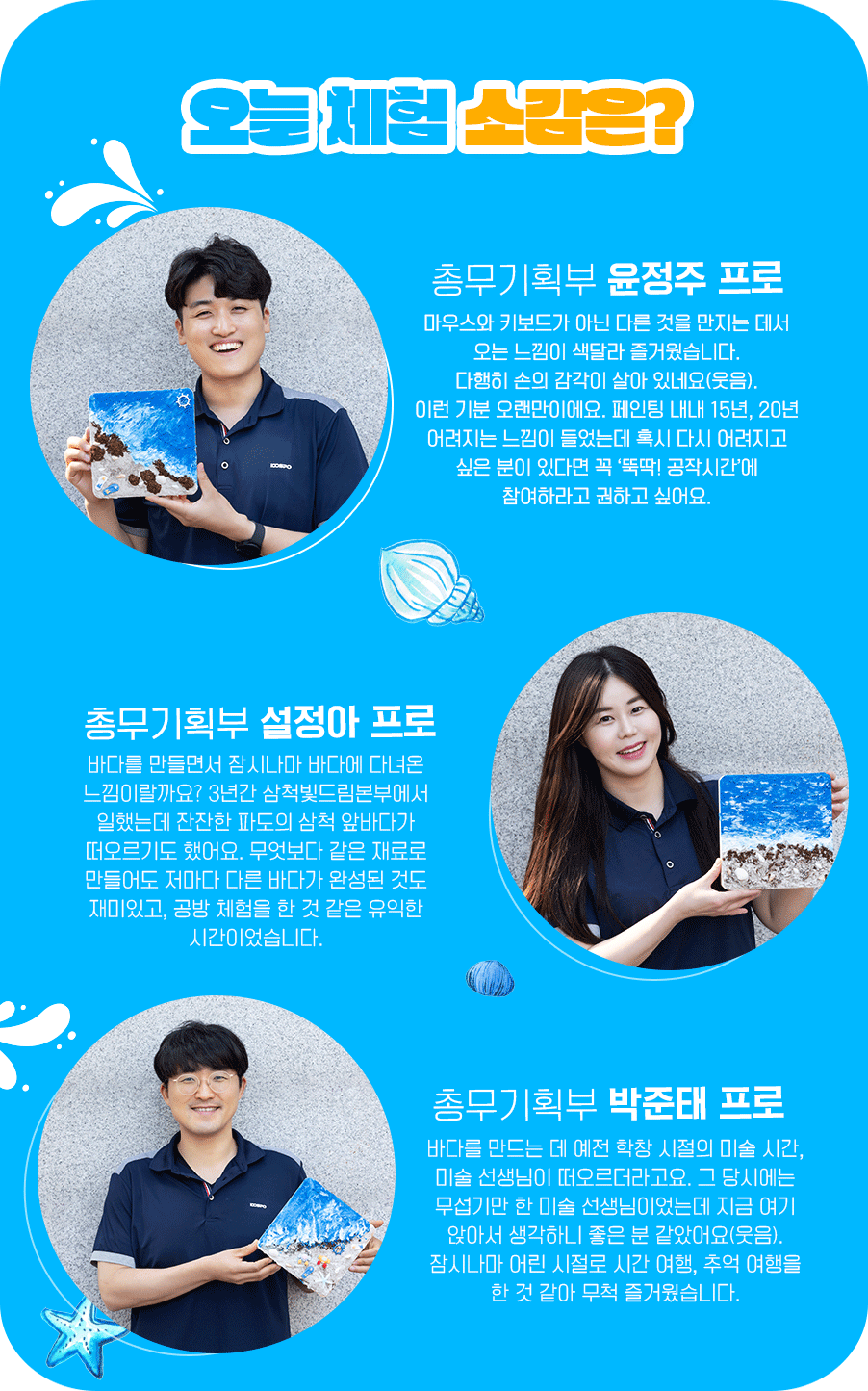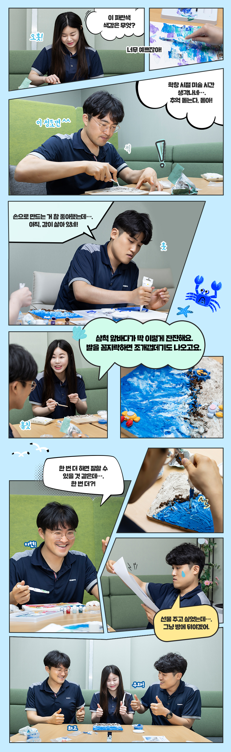 부산빛드림본부 사람들이 매일 보는 바다지만, 그래도 여름이니까 또 보고 싶은 게 바다다. 스컬프처 페인팅으로 미리 푸른 바다를 느낀 공작시간. 평면 위의 바다가 아니라 파도가 일렁이는 입체의 바다다.
