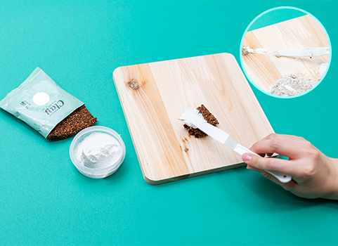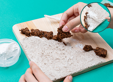 연밤색 코르크클레이과 흰색 플라스터를 원목판에 올리고 나이프로 섞으면서 모래사장의 색상을 만든다.