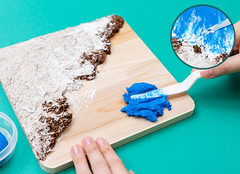 바다를 표현할 파란 플라스터를 남은 원목판에 덮어준다. 흰색의 플러스터와 섞으면 파도를 표현할 수 있다.