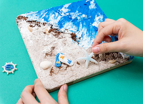 조개나 소라 등의 장식물을 붙이면 완성! 플러스터 자체에 접착력이 있으니 살짝 누르면 붙는다.