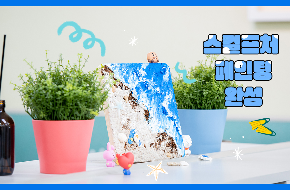 이번에는 푸른 바다를 표현할 차례로 모두 파란색의 플라스터를 펴 발랐다. 그리고 흰색 플라스터로 그러데이션을 해 흰 물결까지 자연스럽게 표현했다. 윤정주 프로는 바위가 많은 바다를 만들겠다며 무심한 듯 손으로 코르크클레이를 뚝뚝 뜯어 붙였다. 세 사람은 입체감을 살리기 위해 나이프를 잡은 손의 힘을 조절하며 흰색과 파란색 플라스터를 잘 섞었다. 터치감에 따라 다양한 결과물을 볼 수 있는 것이 매력이다. 마지막으로 액세서리를 이용해 장식하면 끝.